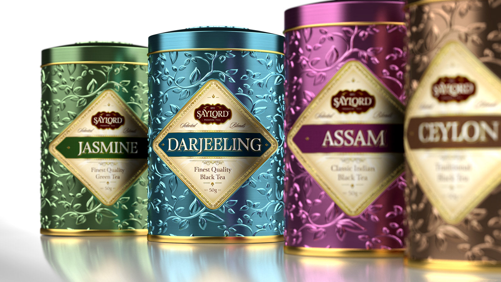 Packaging Designer Anastasia Ziemba (USA) and 3D Artist Paulo Madeira (Sweden) created a new design and brand identity for the collection of Saylord brand premium teas. The story of these finest quality teas demanded a rich, luxurious design with lots of texture and use of gold. The gourmet loose tea range consists of four teas - Assam, Darjeeling, Ceylon premium black teas and Jasmine selected blend green tea, which are clearly defined by tin and label colors. The tin is embossed with ornamental tea leaves, that gives it good grip and pleasant feel when holding in hands. The label's rich colors and lots of gold embossing commands a distinct regal look. This design gives elegance and high class to satisfy even the most sophisticated taste of customers.